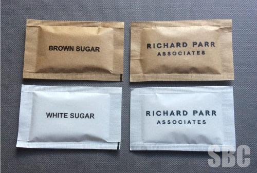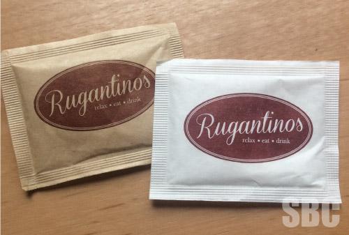RUGANTINOS White and brown sugar sachets for this family run Italian restaurant on the cathedral green in the city of Wells in Somerset.