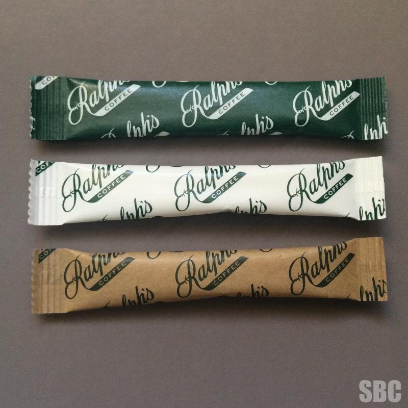 of your personalised sugar sticks including CMYK (four colour process) The print process is Flexographic. Unlike the branded sugar sachets there is a Front’ where the main graphics are displayed, and ‘back’